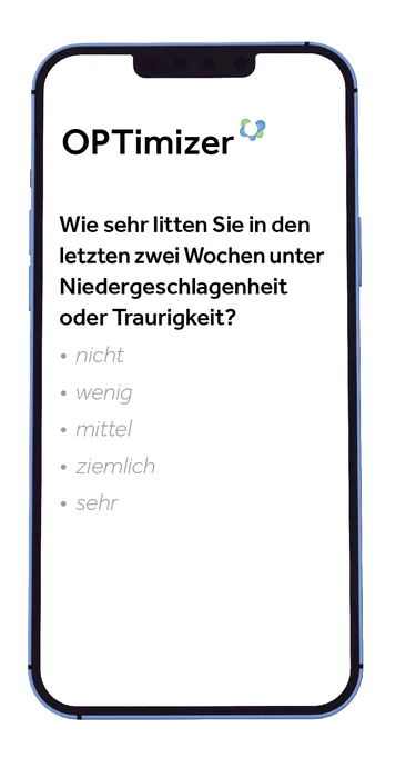 Mit unserer App OPTimizer begleiten wir die Behandlung unserer Patienten noch besser. Ein einfaches Beantworten von Fragebögen erlaubt uns, gemeinsam die Therapie noch gezielter zu steuern und das bestmögliche Behandlungsergebnis zu erzielen.